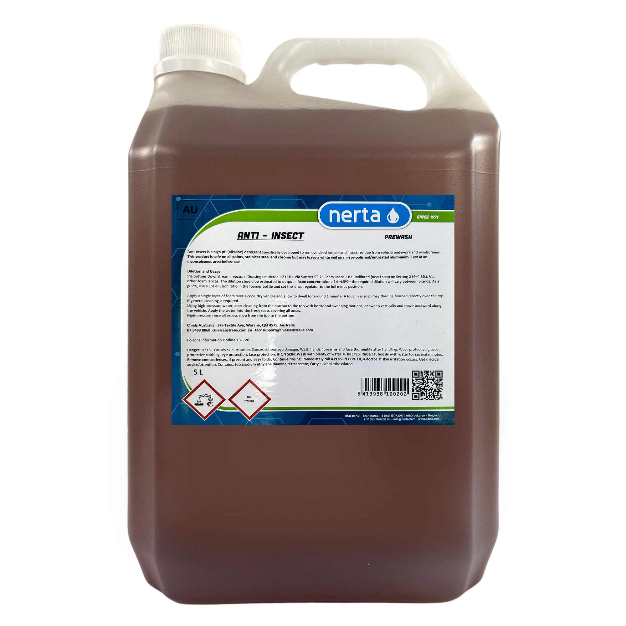Nerta’s Anti-Insect is a high pH (alkaline) detergent, specifically developed to remove dead insects and insect residue from vehicle bodywork and windscreens. Anti-Insect can be used alone or as a pre-wash with another foam-on soap.