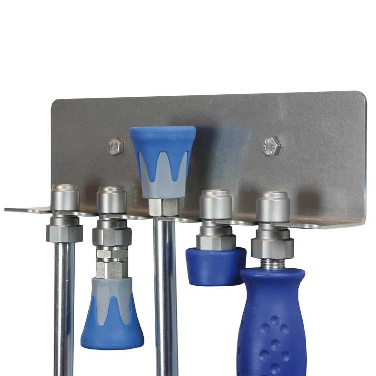 Stainless-steel wall-mounted holder for five lances. Keeps lances organised and reduces risk of damage.